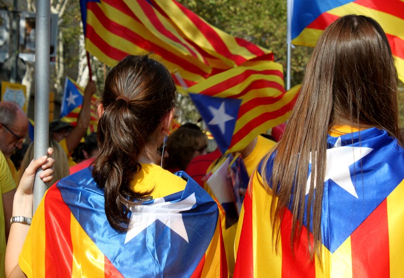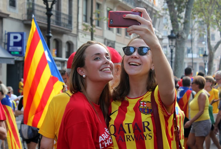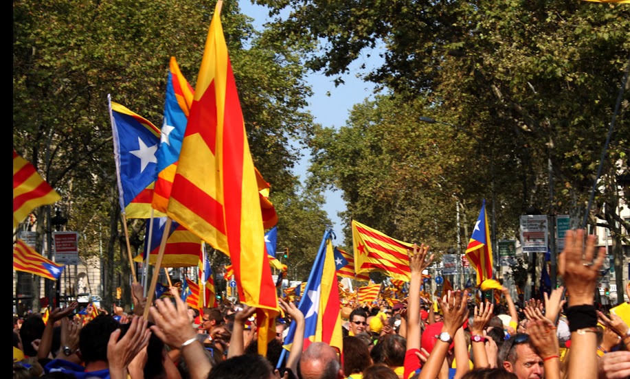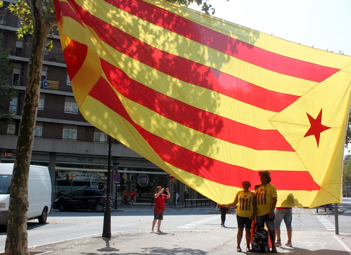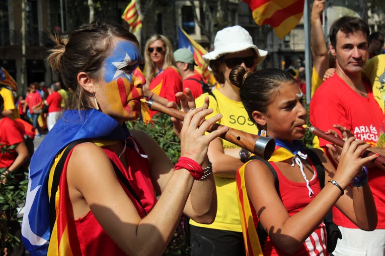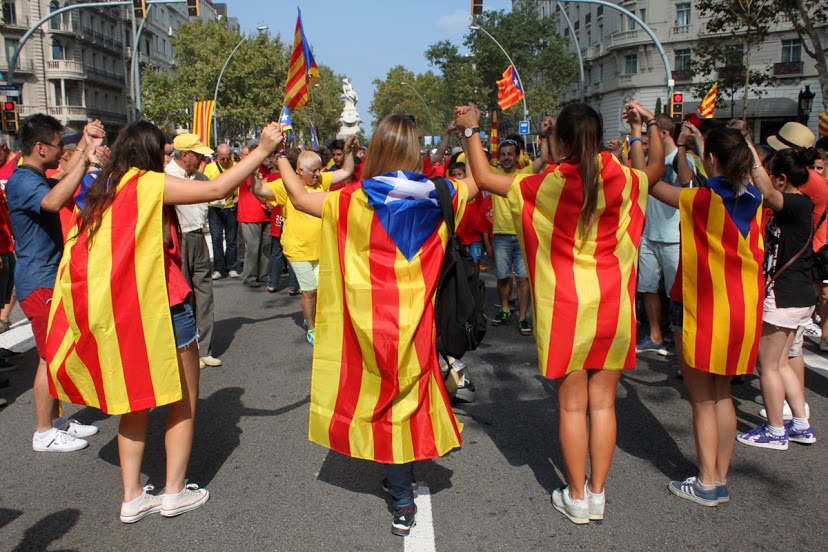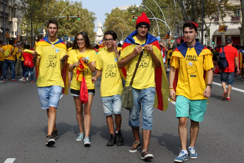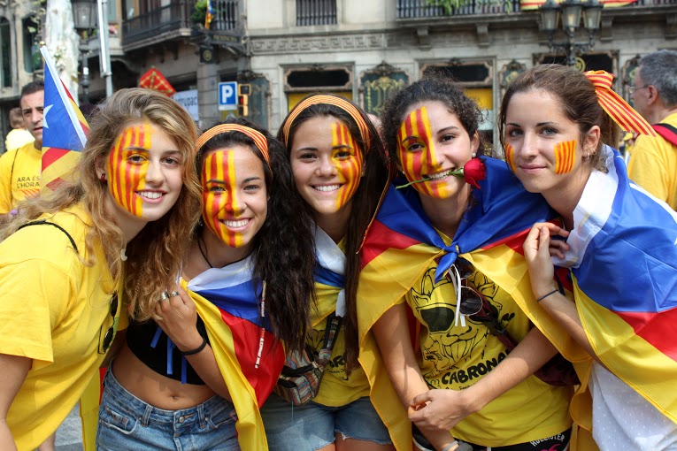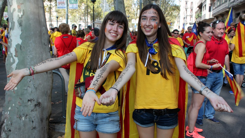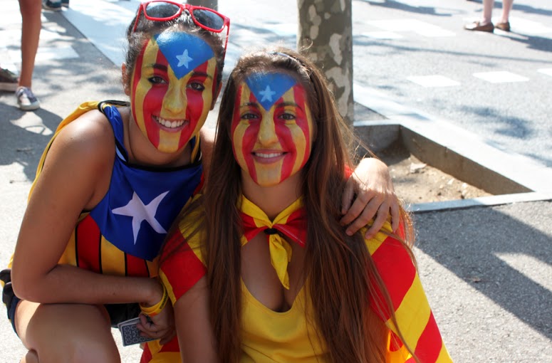 Caras pintadas, brazos pintados, pañuelos, camisetas, gorros, sombreros y abanicos. Todos con los colores de la bandera tradicional de los Reyes de la Corona de Aragón que se usaba como expresión de soberanía y que hoy, es la bandera del movimiento catalán. Un movimiento que a raíz de la crisis económica, ha agudizado una identidad que le da la espalda a España. Este es el tercer año consecutivo que Cataluña sale a las calles con un objetivo: Una consulta, el 9N, la independencia.