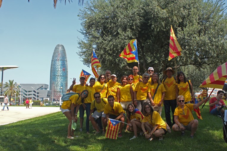 Dejé la bicicleta en la Plaça de les Glóries para continuar a pie y adentrarme a la concentración convocada por La Assemblea Nacional Catalana, una asociación creada en 2013 con el fin de alcanzar la independencia política de Cataluña y Ómnium Cultural, organismo civil político con los mismos fines pero fundado desde 1961, ambos, invitaron a participar a la población para formar una “V” entre dos de las calles más emblemáticas de la ciudad: la Avinguda Diagonal y la Gran Vía de les Corts Catalanes. Una “V” que simboliza victoria, votar y vía catalana, todo ello con el lema: “Ara és I´hora. Units per un país nou” es decir,”Ahora es la hora. Unidos por un país nuevo”.